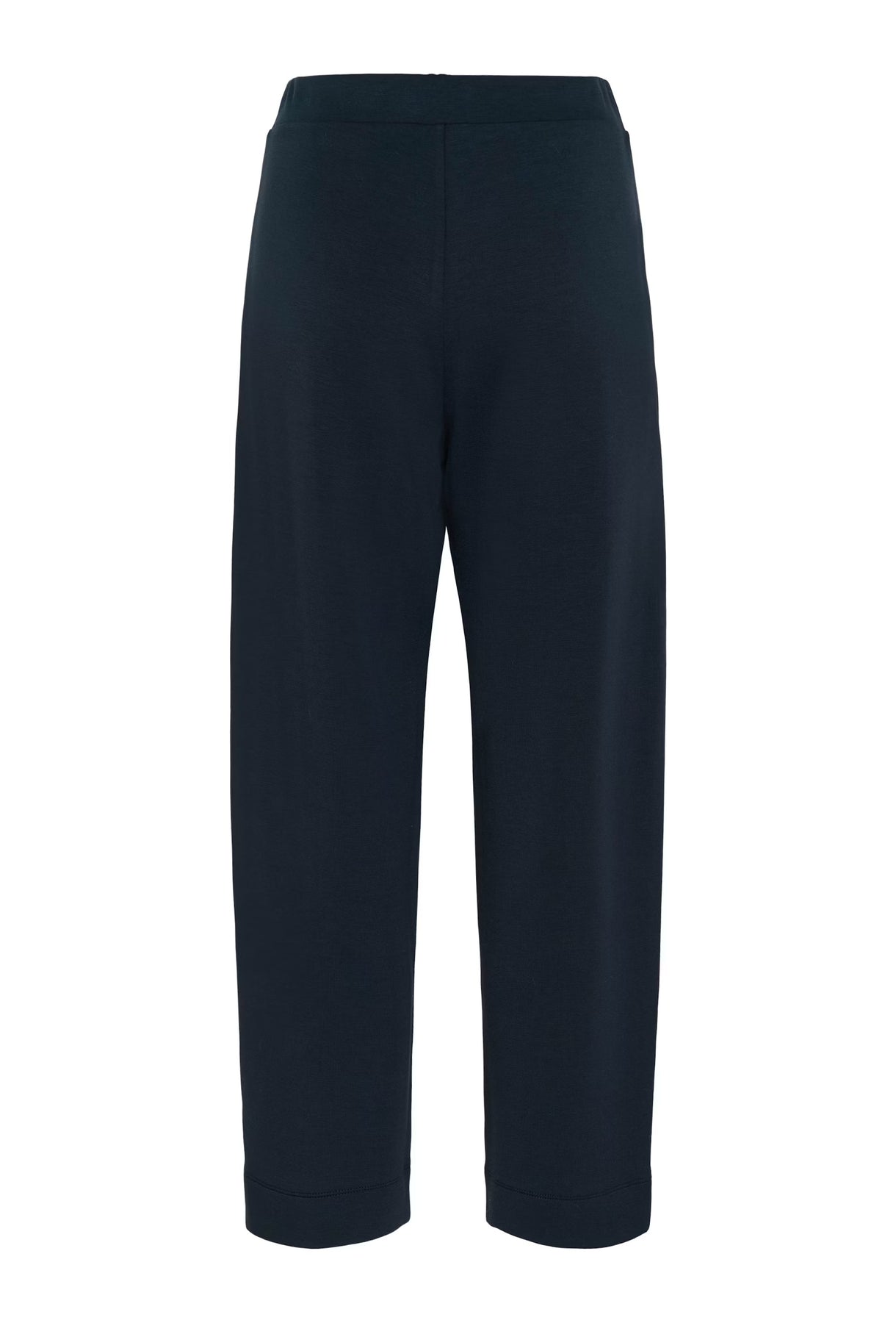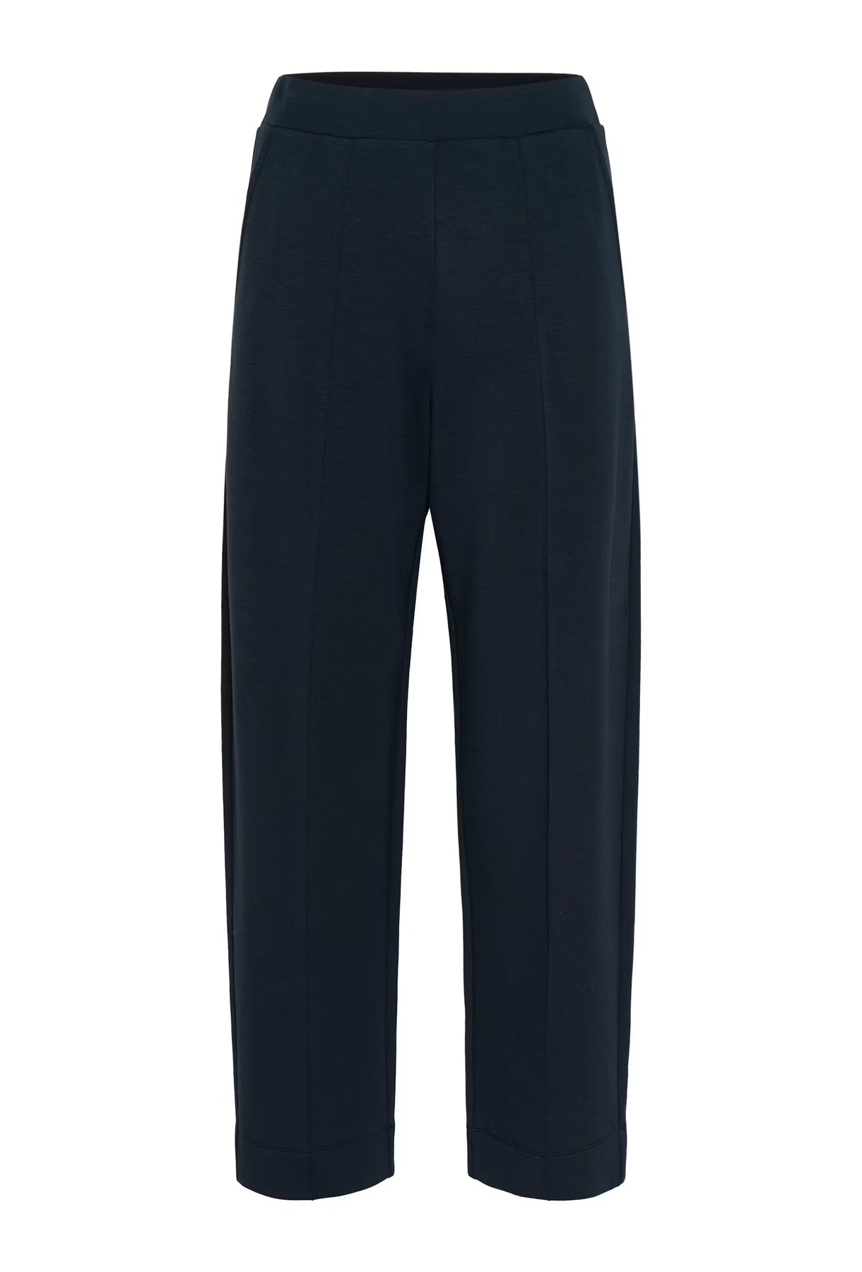 The model is 174 cm tall and wears a size M. These dark navy trousers feature a classic straight fit with pressed creases for an elegant, polished look. The elastic waistband ensures a comfortable fit, while the soft fabric makes them ideal for both work and relaxed days. Style with a shirt or knit depending on the occasion.