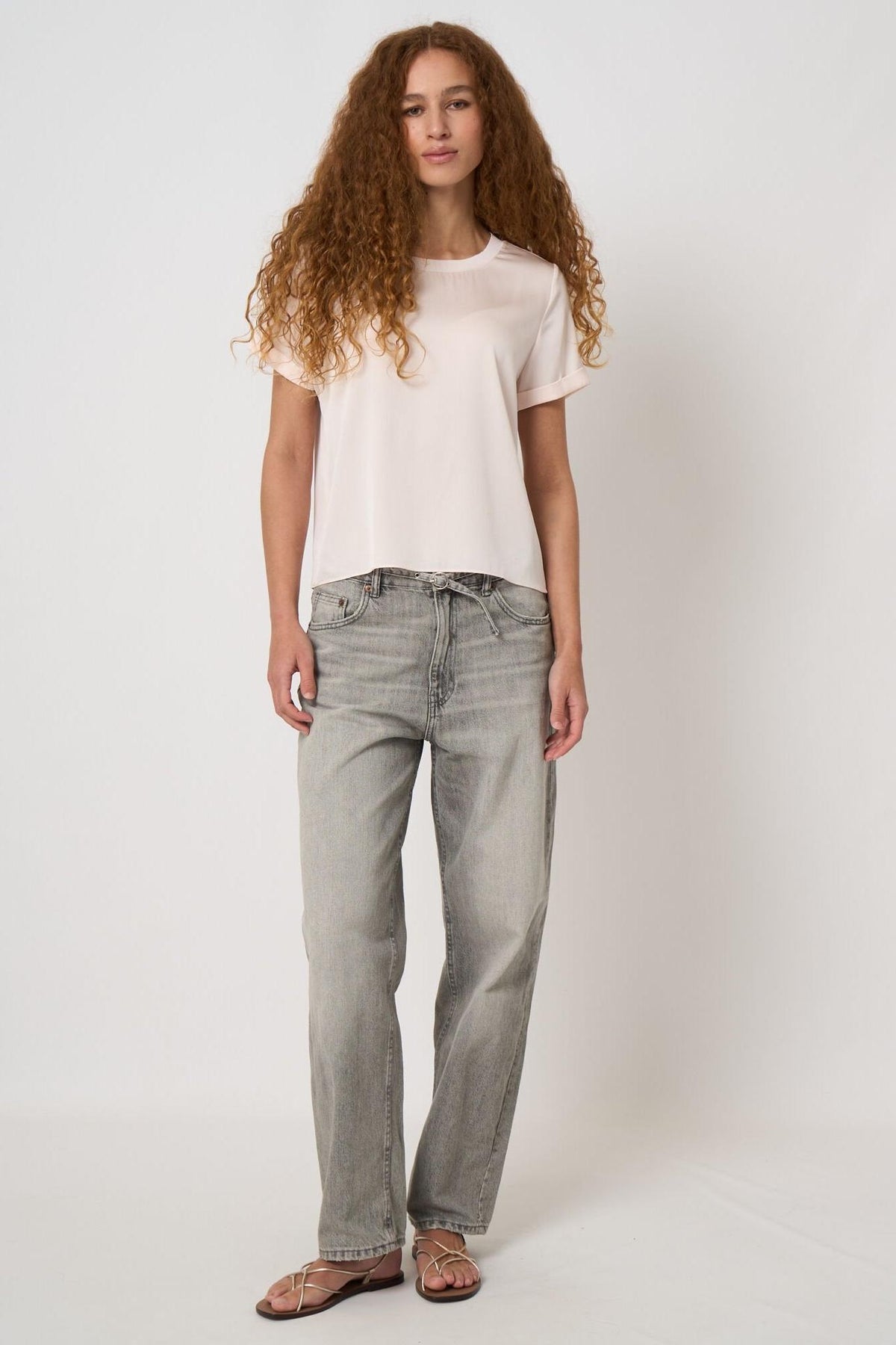 Crafted from supple stretch silk satin, the top feels smooth and fluid, finished with a rib-knit round neckline. A relaxed, straight cut creates a clean, straight hem and rolled-up short sleeves. Effortlessly versatile from desk to dinner, it layers seamlessly under tailoring or knitwear by REPEAT cashmere.