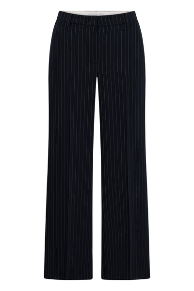 Xenia est un pantalon classique à rayures fines et à jambe large. Avec ses empiècements raffinés sur le côté (au-dessus des poches), sa couleur anthracite neutre, sa fermeture classique et sa jambe large sans fin, il a l'air robuste et classique à la fois.