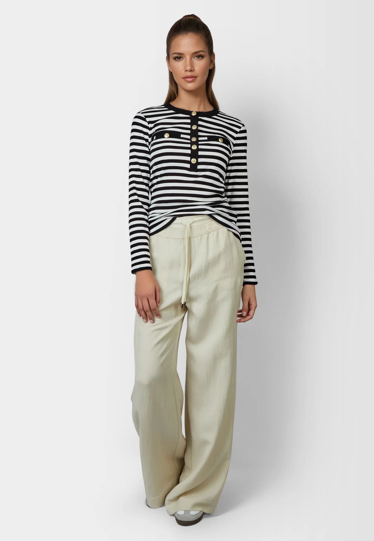 This sweater, made of stretchy ribbed jersey, impresses with an elegant button placket at the crew neckline. Gold-colored decorative buttons add a stylish touch, combining relaxed elegance with a modern flair.