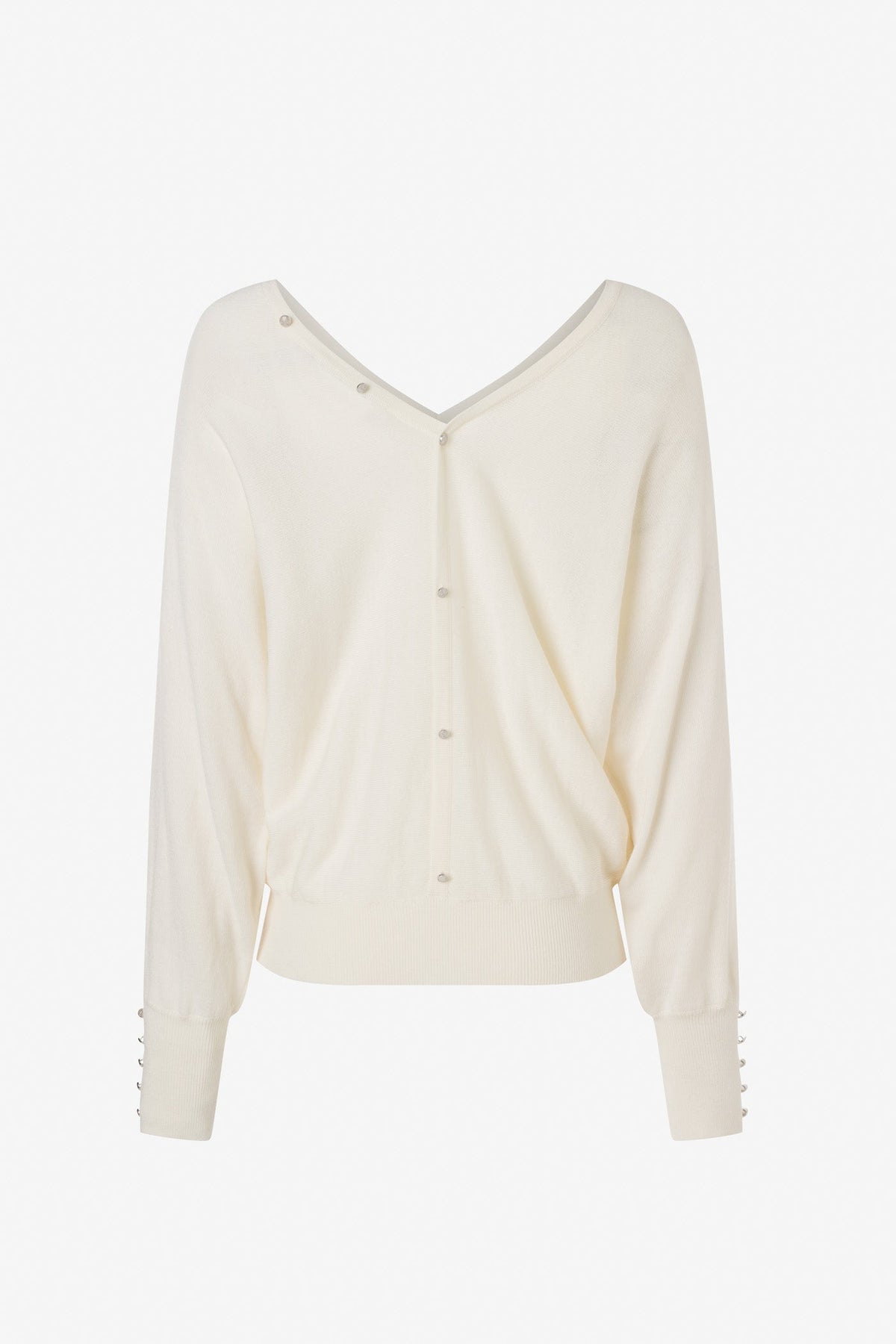 Long-sleeved fine knit in merino blend combining softness and elegance. The button detail on the back adds a subtly refined touch to this timeless piece.
