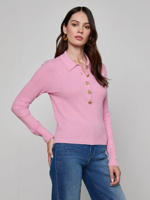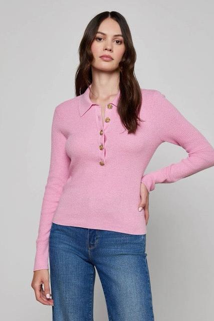 The L’AGENCE essential long sleeve knit and one of our fashion director’s favorite closet heroes. This classic henley top is now back in pink with floral buttons.