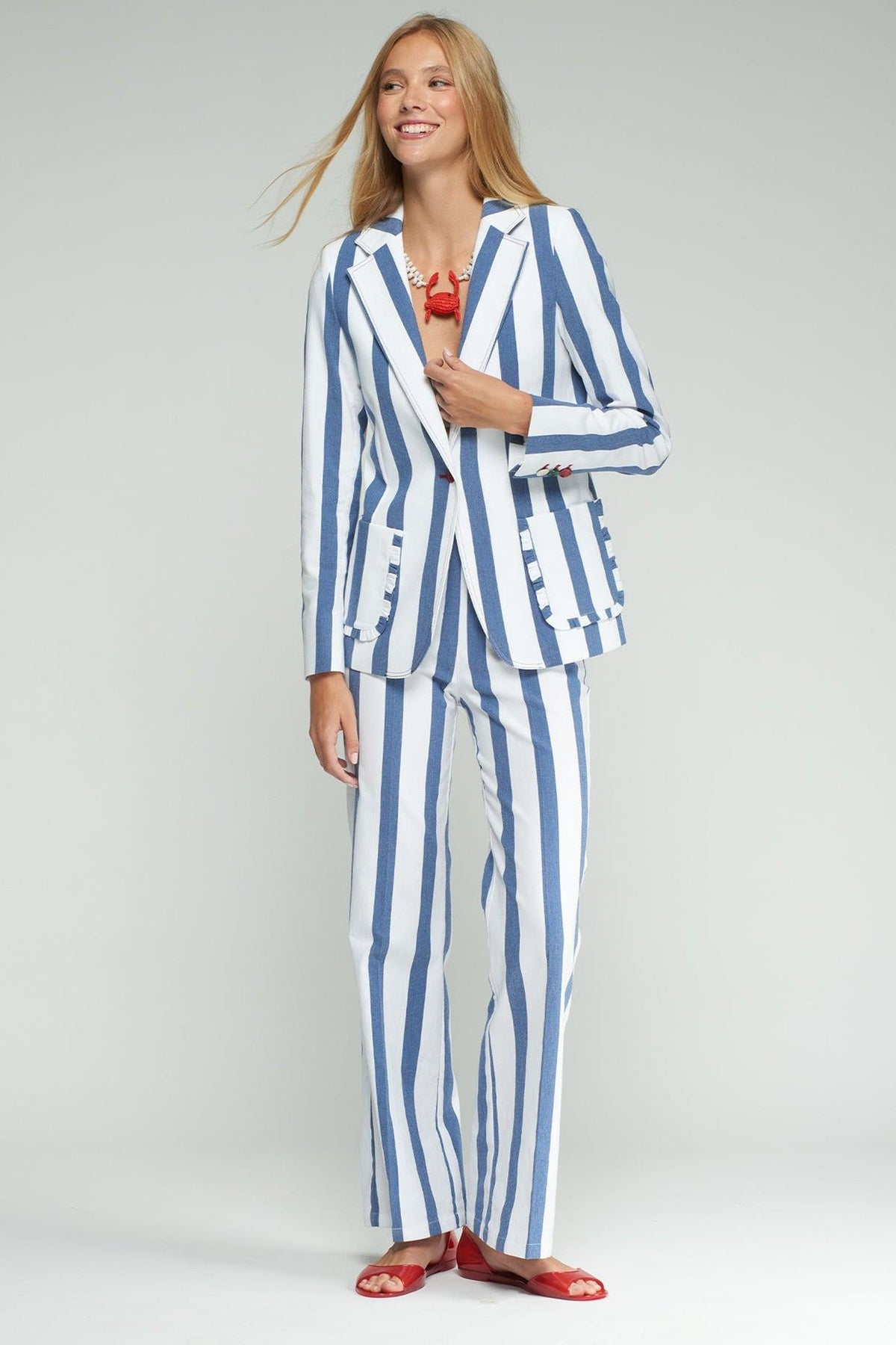 Blue and white vertical striped jacket with classic lapel and contrasting single-button front closure. Front pockets with ruffled trim.