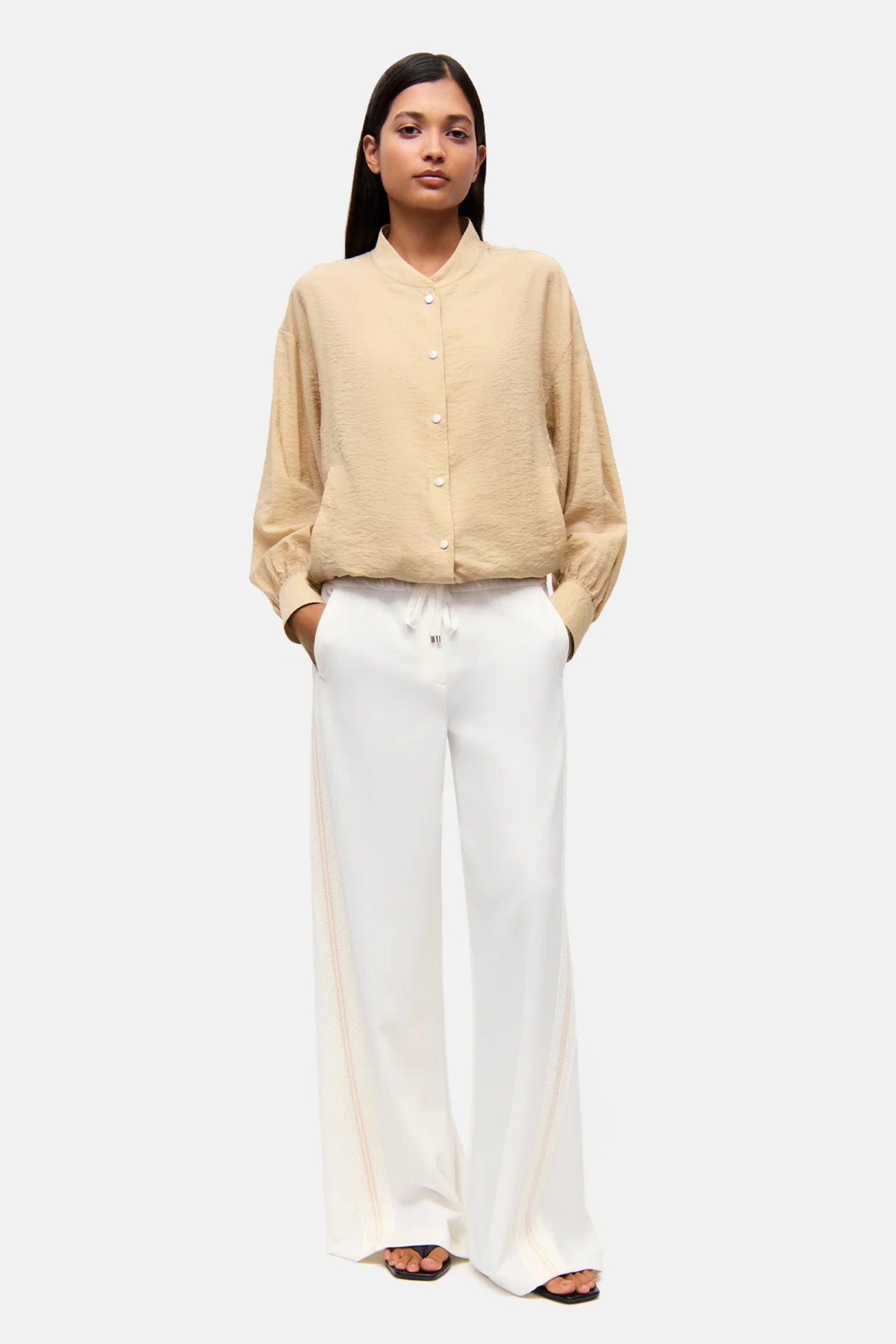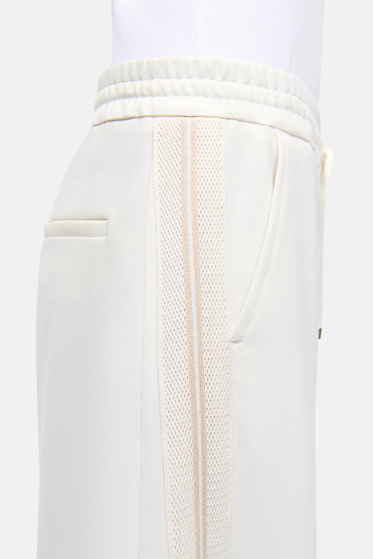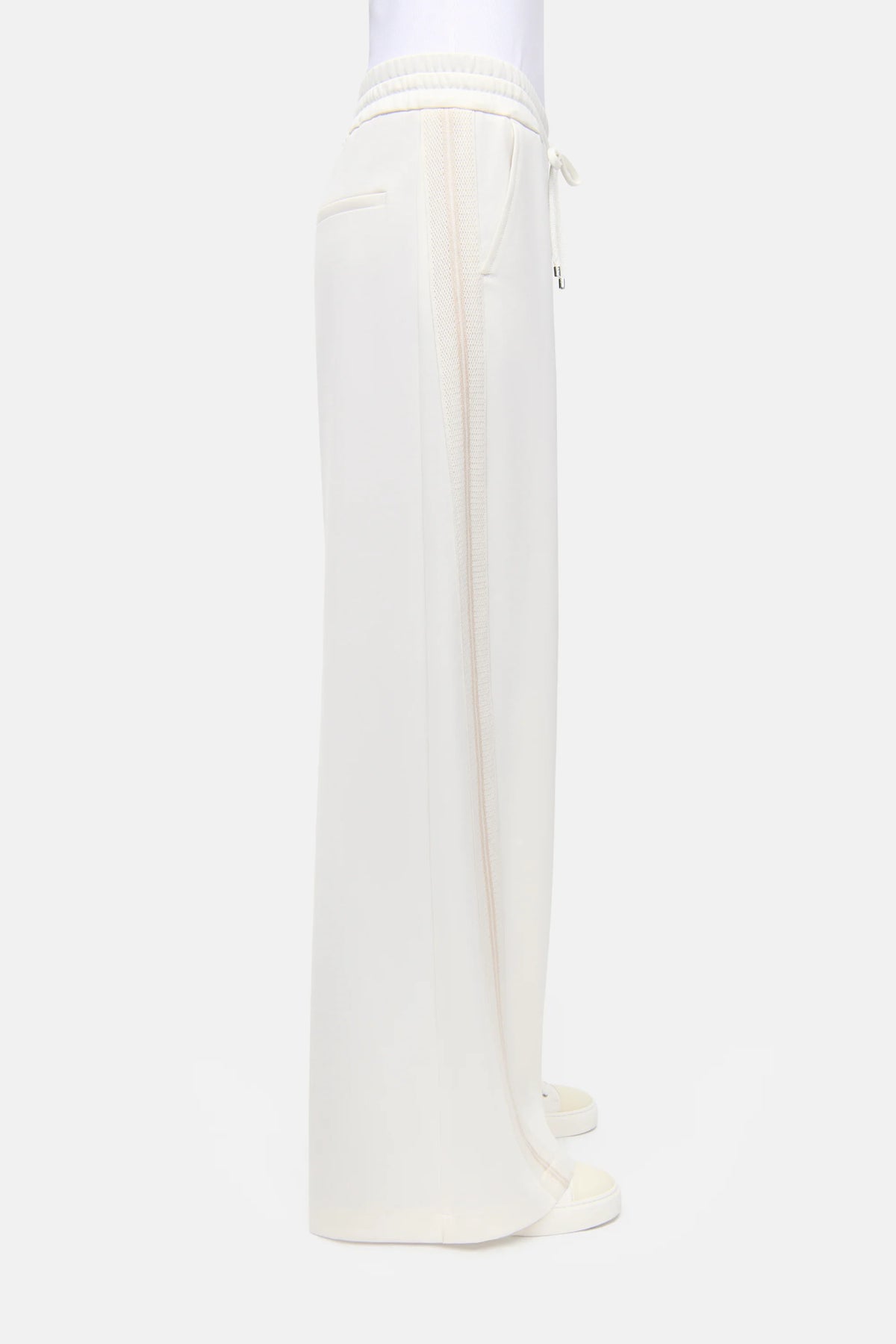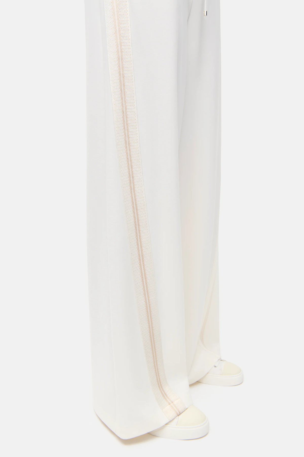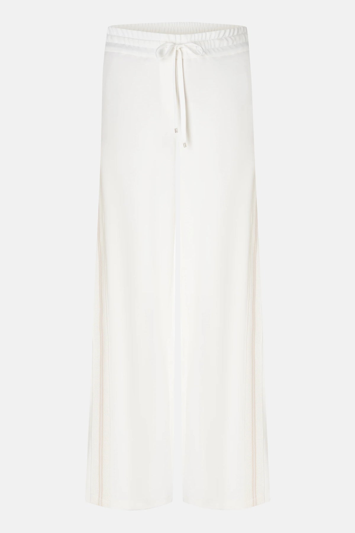 Wide-leg trousers ANABELLE in full length, off-white. These trousers impress with their modern wide-leg silhouette and a flowing, soft drape – perfect for a relaxed, stylish look. Side bands and a drawstring add sporty-elegant accents and give the trousers a modern twist. The lightweight polyester bistretch fabric offers exceptional comfort, a soft feel, and easy care – a versatile favorite for everyday wear.