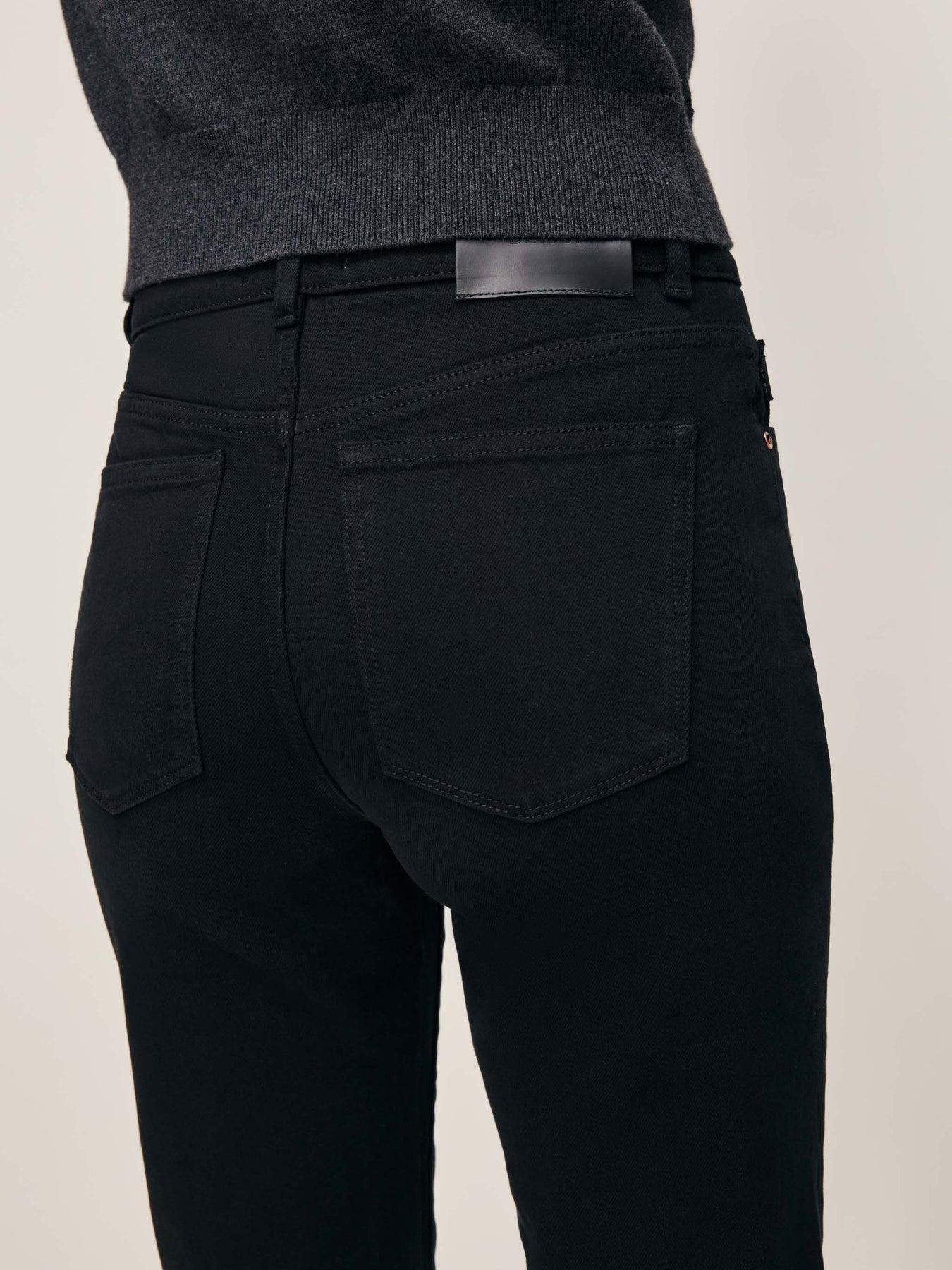Black is a true black denim. It features a silver shank, copper rivets, tonal stitching, a clean hem and a black back patch.