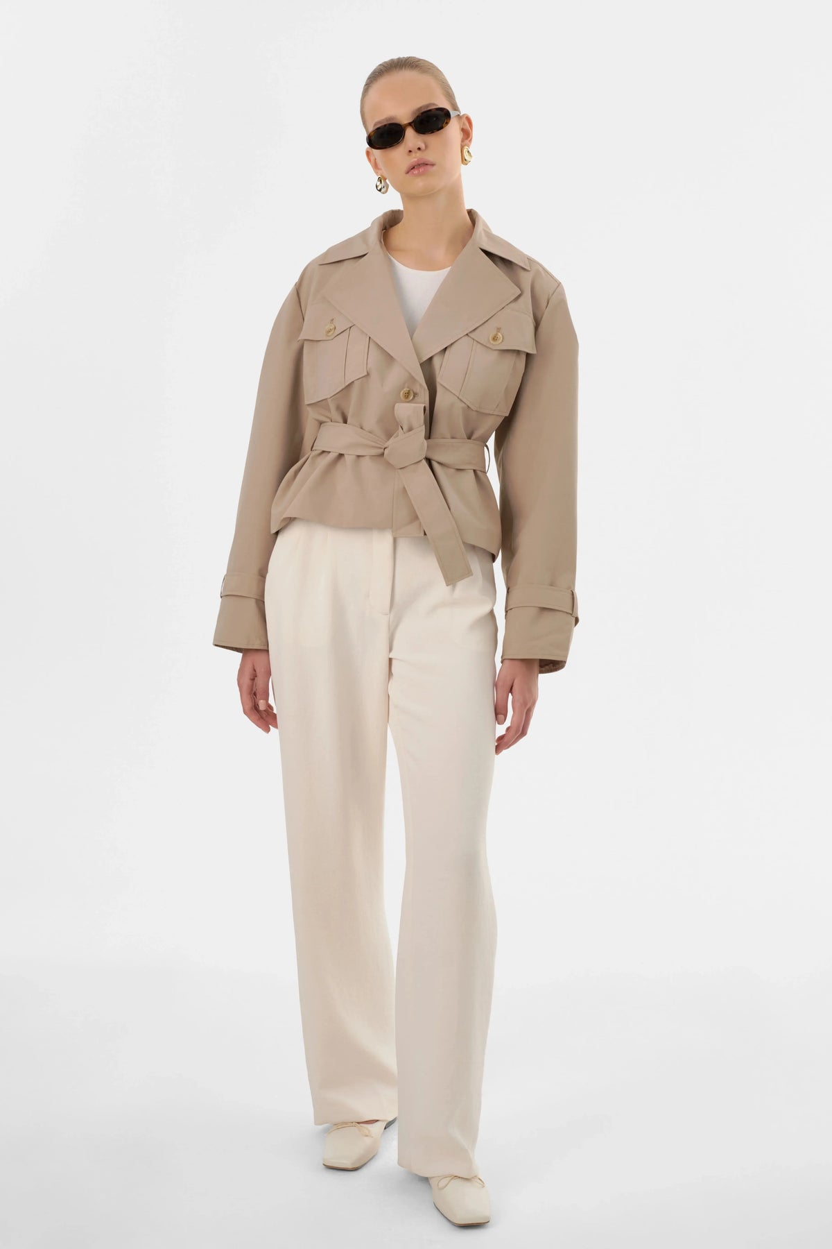 The QUINN Cropped Trench Coat reimagines a timeless silhouette with a chic, modern spin. Featuring a defined waist and voluminous sleeves, it offers a refined statement piece. Perfect for the fashion-forward woman seeking a versatile outer layer, this jacket brings polished style to every look.