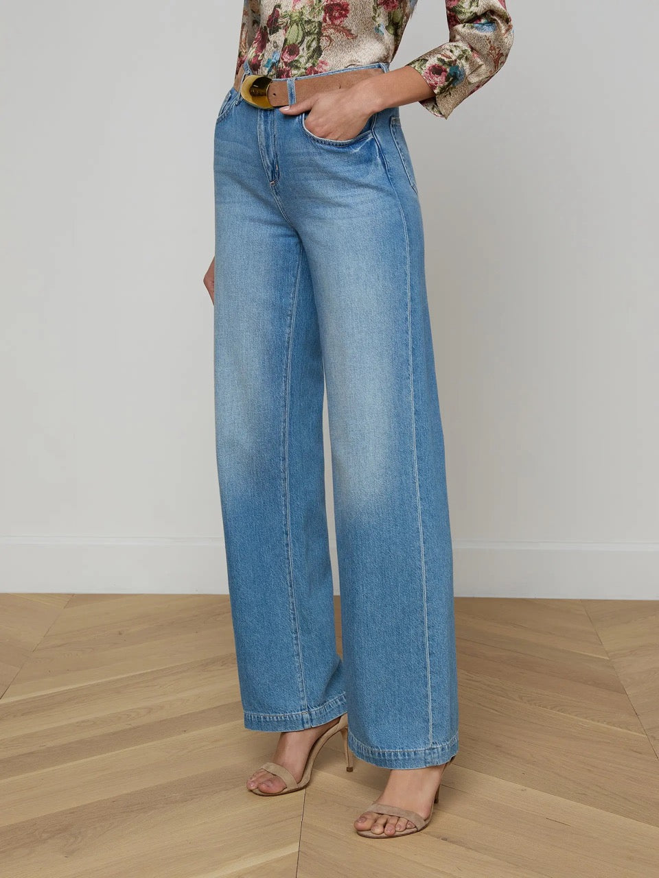 Our polished wide-leg jean. A contoured waistband sits securely at the natural waist without gaping. Designed to run fitted through the hips before releasing into a relaxed leg, the Scottie is a flattering, perfect-for-everyday jean. Now in a light wash with subtle whiskering and fading details, designed to contour the leg for an elongating look.