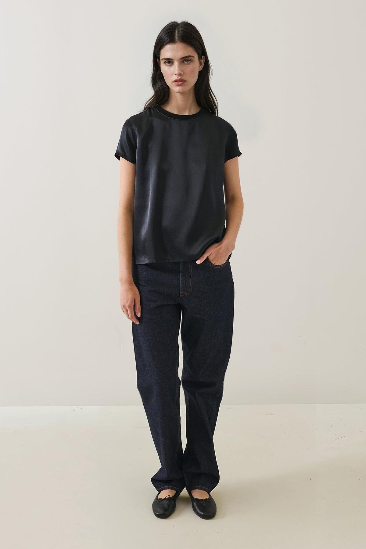 Our slim silk shirt is crafted from a sophisticated mid-weight 100% silk satin fabric. It is cut in a slightly relaxed fit and features a true shoulder and feminine ribbed neck trim. This piece is ideal to layer under your favourite Fall jacket for added elegance this season.