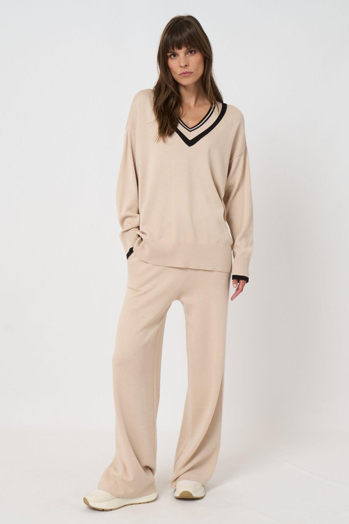 Contrast-Trim Cotton-Viscose V-Neck Sweater Natural