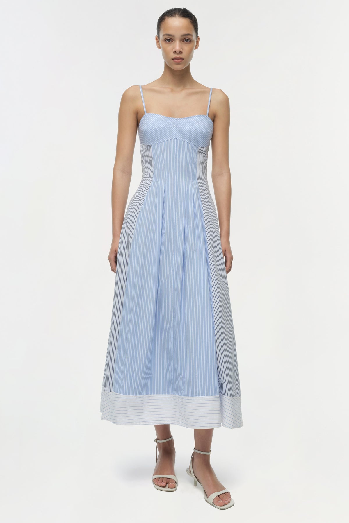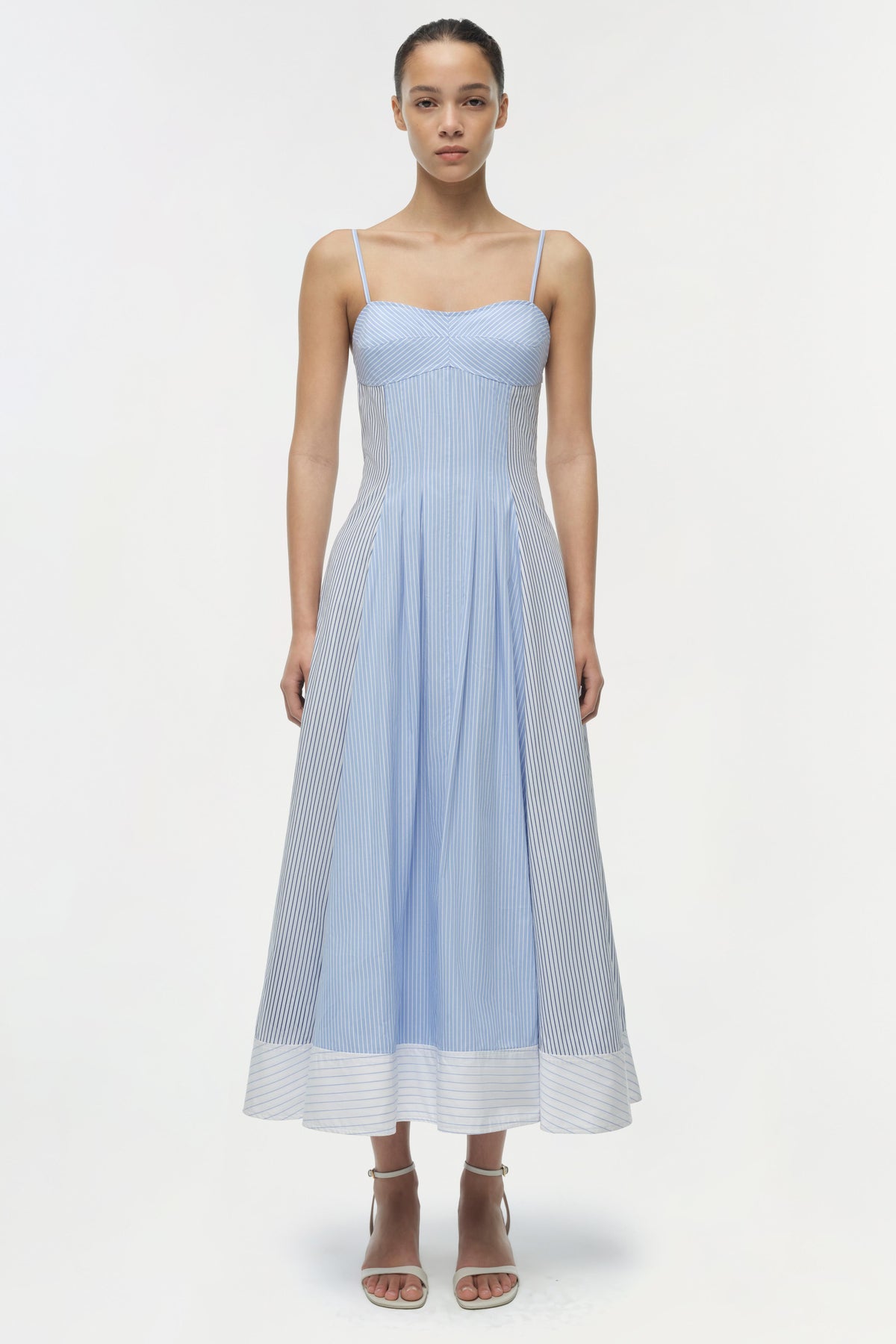 The Chamberlain Cotton Midi Dress in Periwinkle Multi Stripe. Crafted from lightweight cotton, this dress has a structured bodice and a softly pleated skirt. Cut to a flattering midi length, the silhouette is finished a delicate cami neckline for an effortless, refined mood.