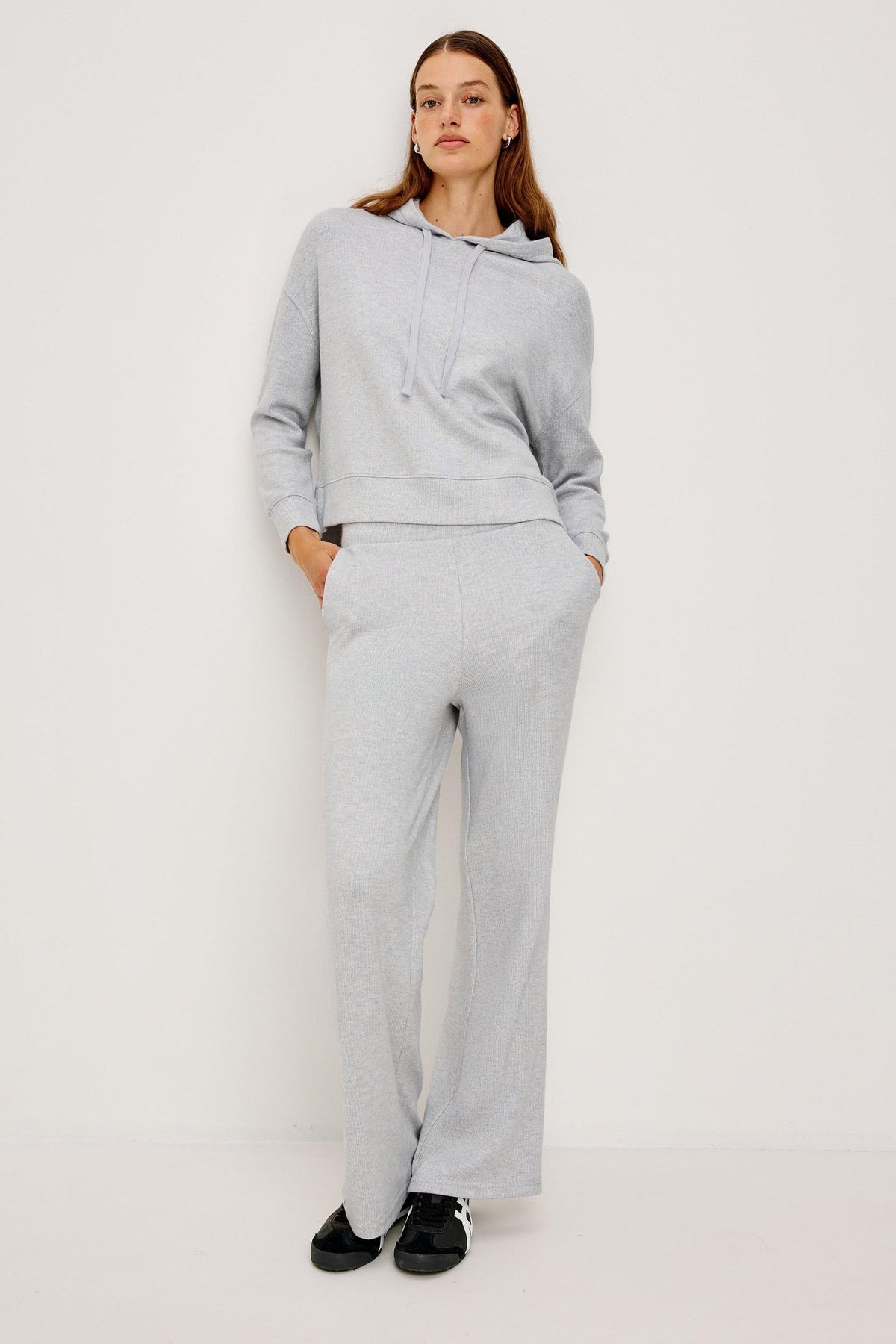 The Ellery is a wide-leg pant in a soft, brushed cozy rib lounge fabric. Designed with an elastic waist for easy, pull-on comfort.