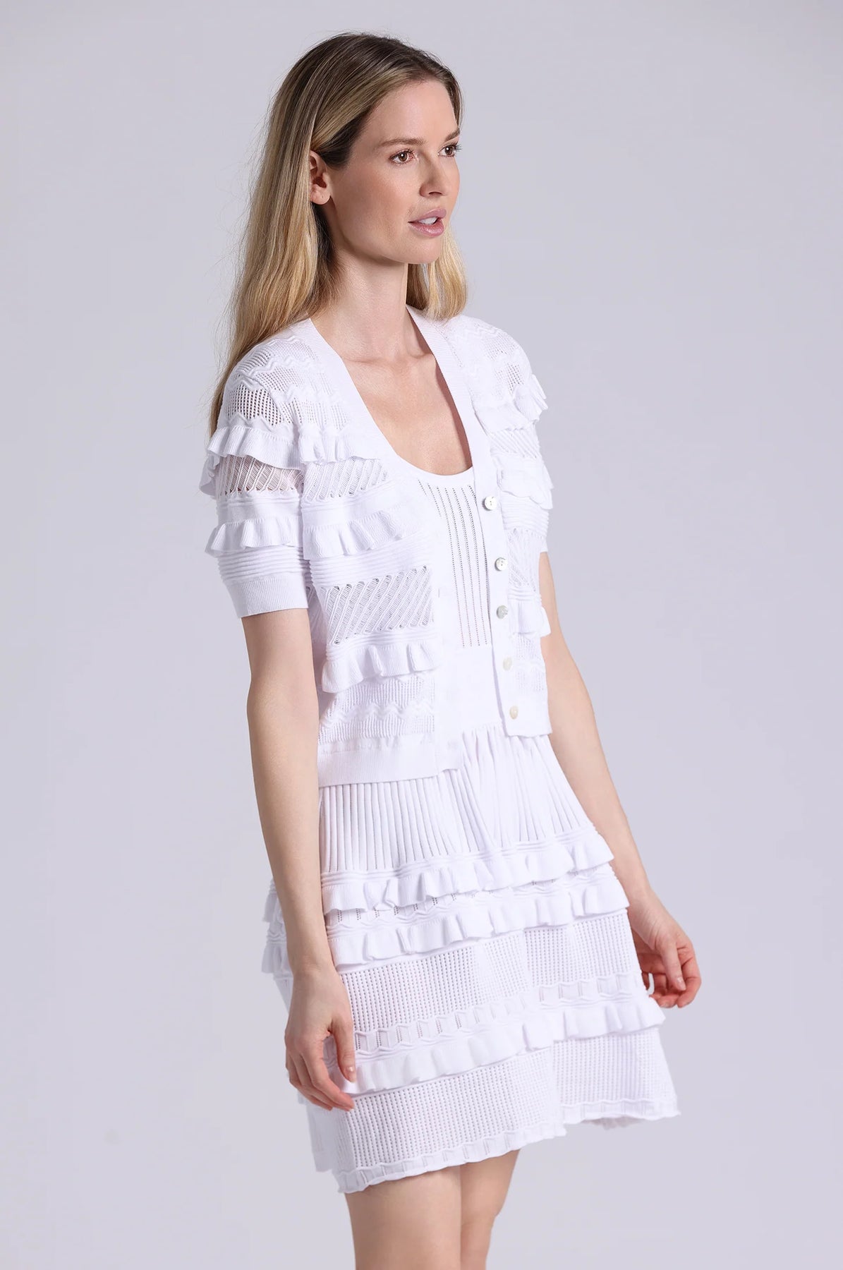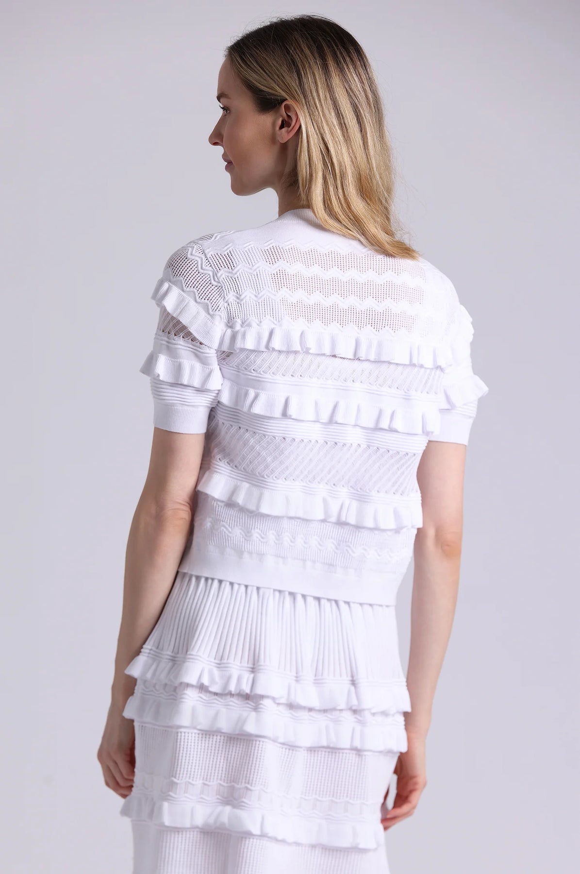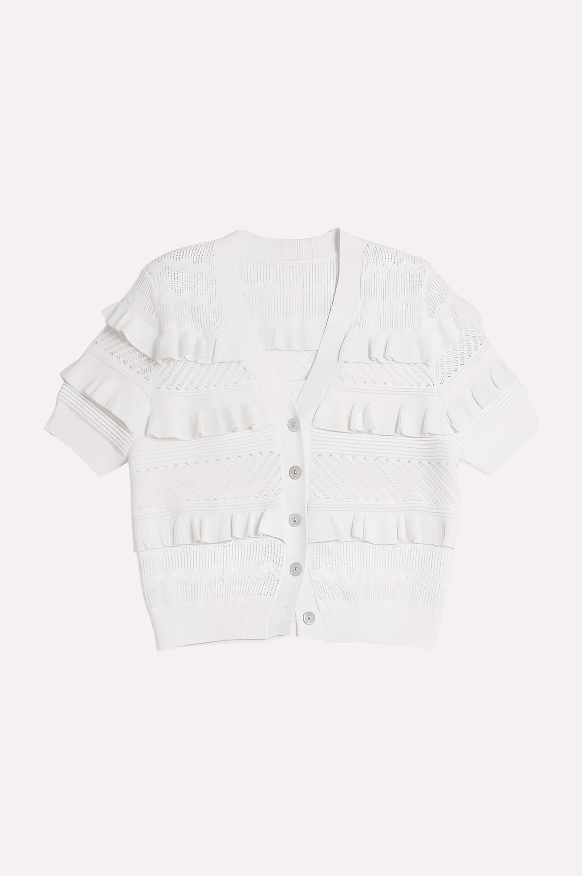 Airy pointelle viscose shaped into a short sleeve silhouette with gentle puff through the body and sleeves. Finished with a 360° ruffle button-down front and fitted sleeve and hem trims for definition.