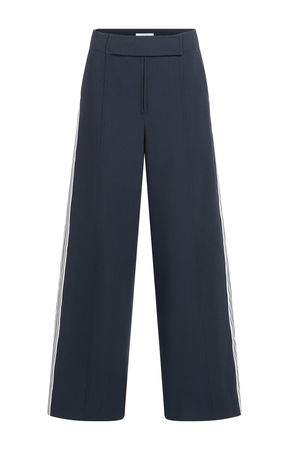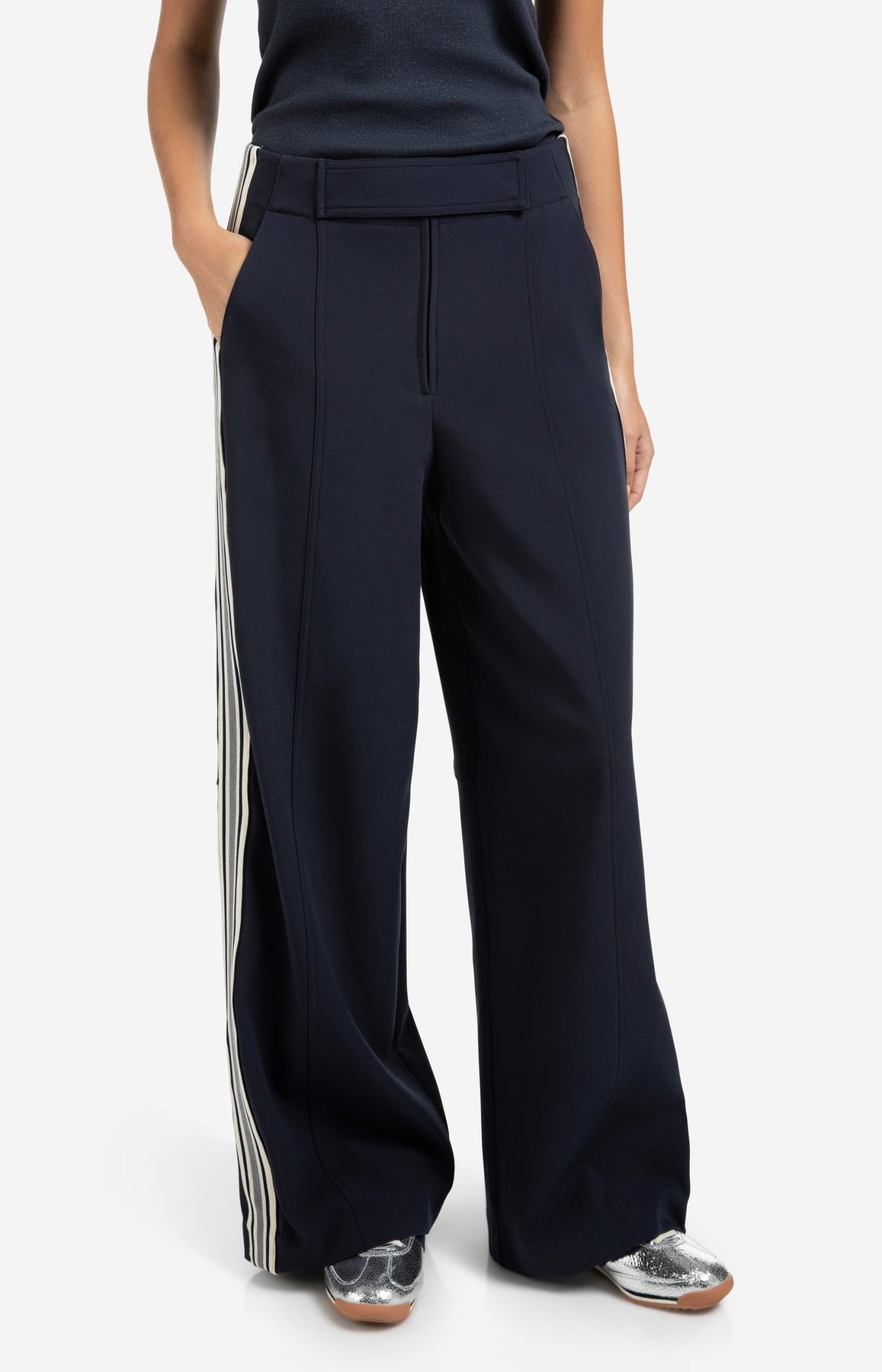 These elegant trousers feature a high waist and wide legs for a flattering, modern silhouette. The side stripes add a sporty and stylish touch. Finished with side pockets and welt pockets at the back. Crafted from a soft and comfortable fabric, perfect for creating a casual-chic look. The model is 175 cm and wears size 36.