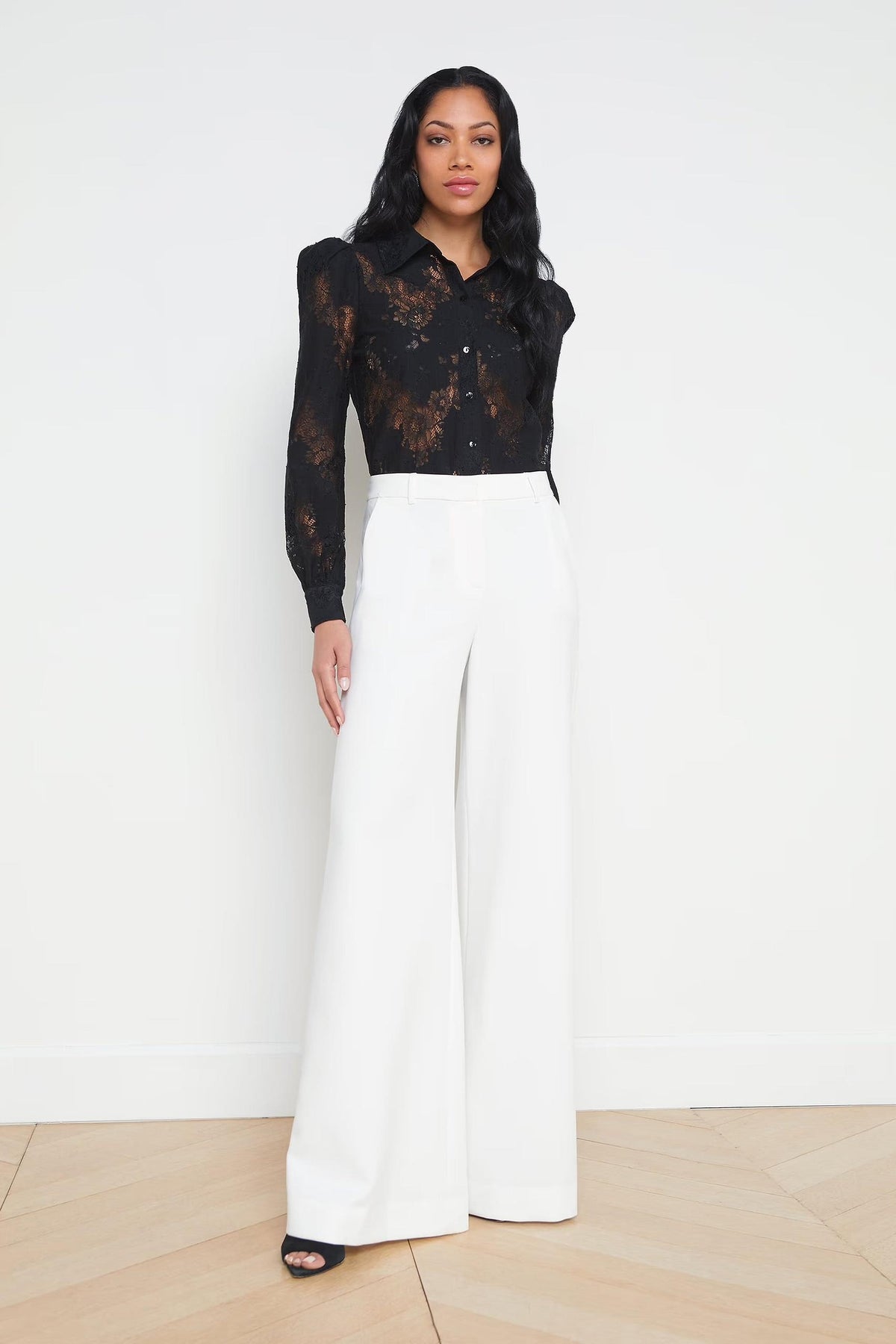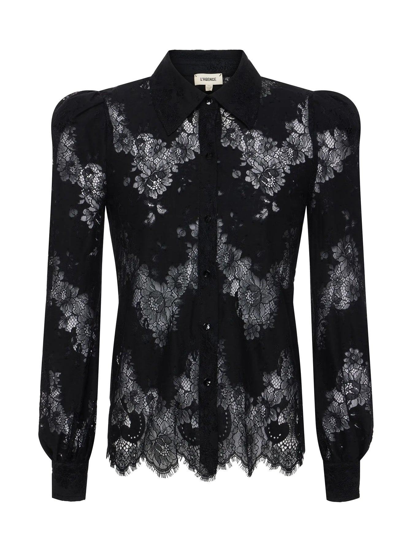 Our most feminine button-up blouse, now in chic black lace. Puff shoulders create gentle volume while a sharp collar adds definition. Pair with white denim for a romantic day-to-night look.