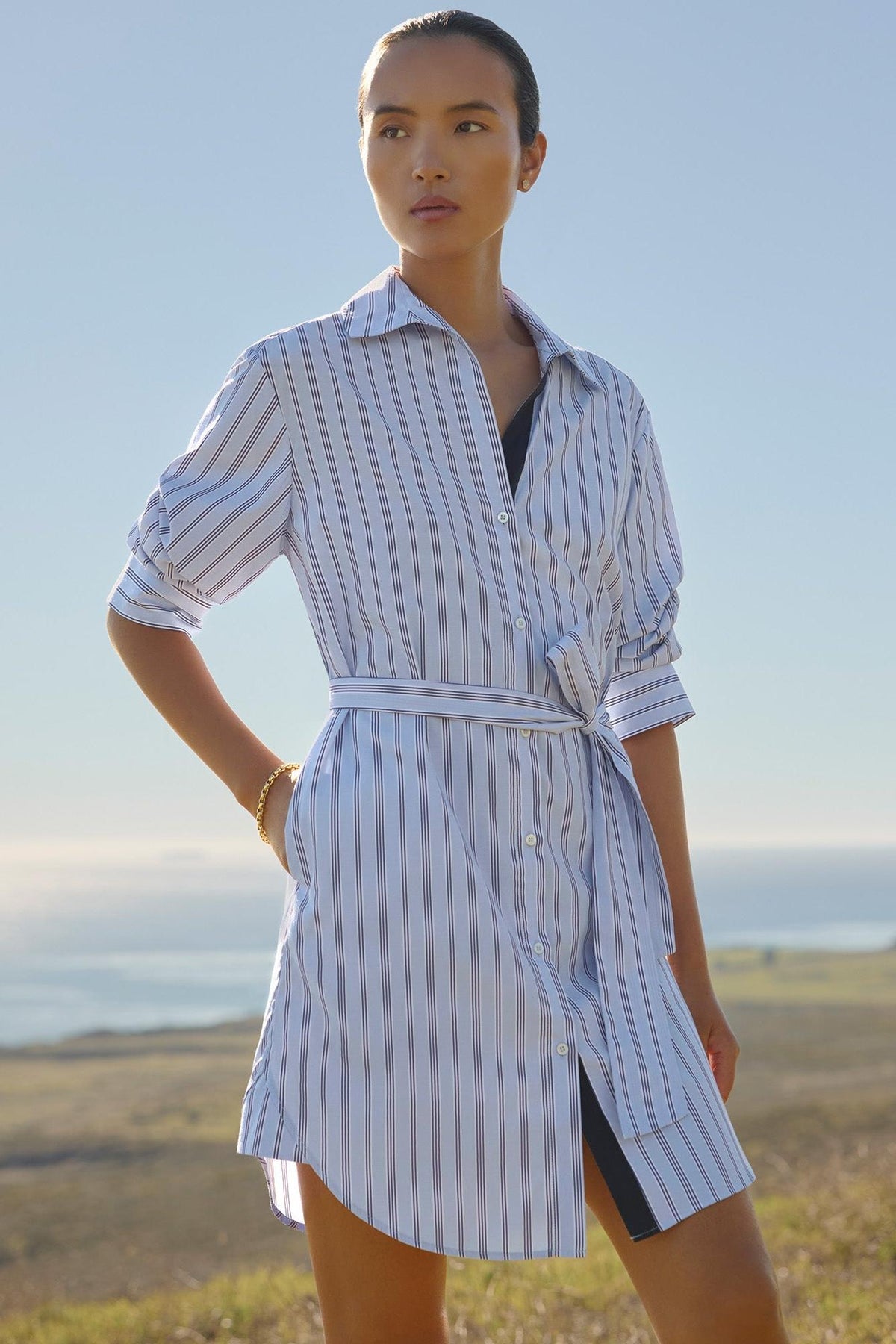 Our Pia Dress reimagines a best-selling shirt as a relaxed yet refined silhouette. Pre-styled sleeves and a belted waist offer subtle sophistication, while classic tailoring ensures day-to-night versatility.