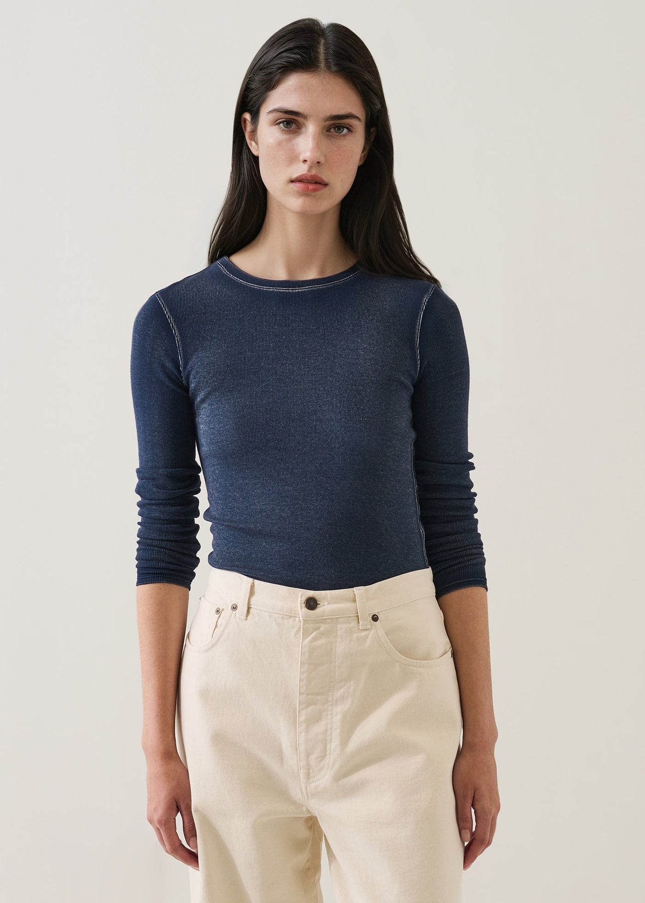 Our ribbed long sleeve crewneck t-shirt is made from our premium cotton modal fabric. This piece is designed for a slim fit and features a crew neckline, branded buttons, and subtle trim detailing.