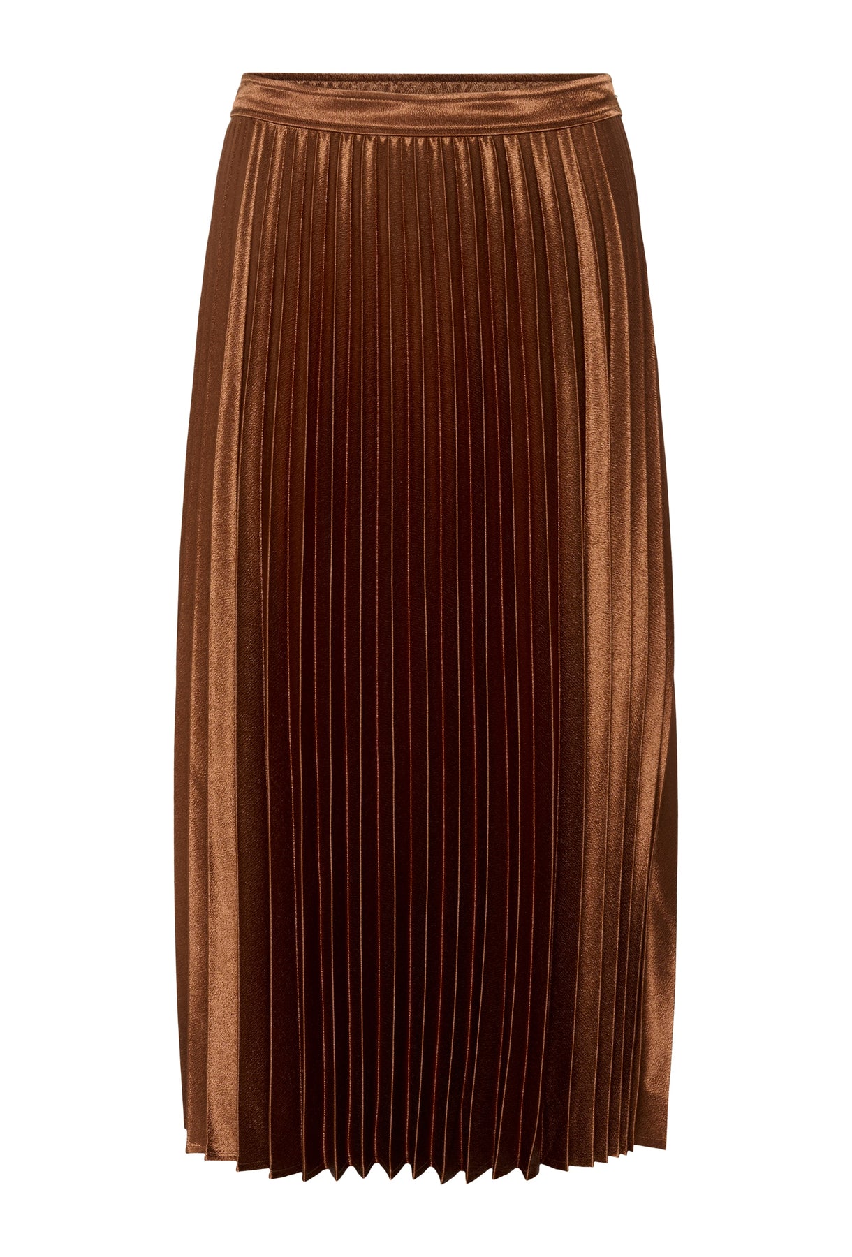 The model is 178 cm tall and wears a size 36. This pleated midi skirt in a warm copper brown shade features a lightly shiny finish and an elastic waistband for comfort and ease of movement. Its feminine silhouette makes it ideal for both everyday wear and festive occasions. Style with a shirt or soft knit for an elegant look.